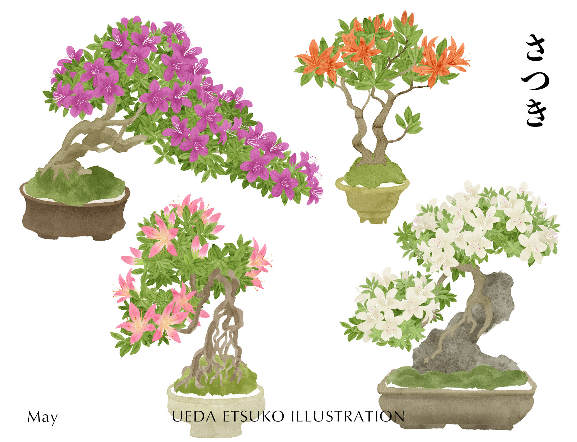 5月はさつき。色形、仕立てで遊んでみました。石付き、根上げなど盆栽の仕立て方もいろいろあります。さつきは人気品種なのでバラエティー豊かです。