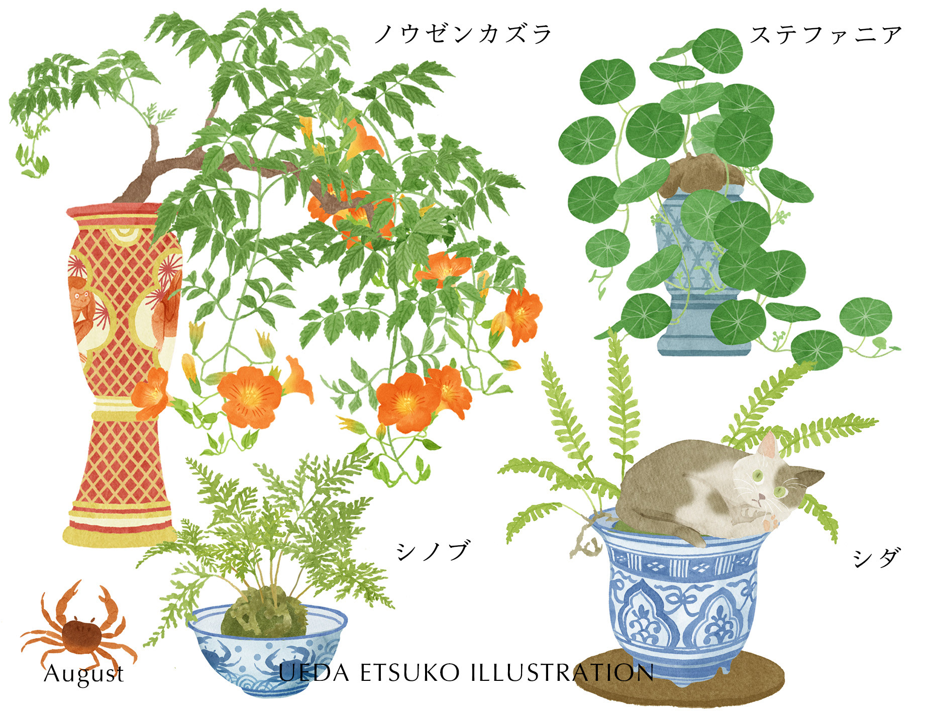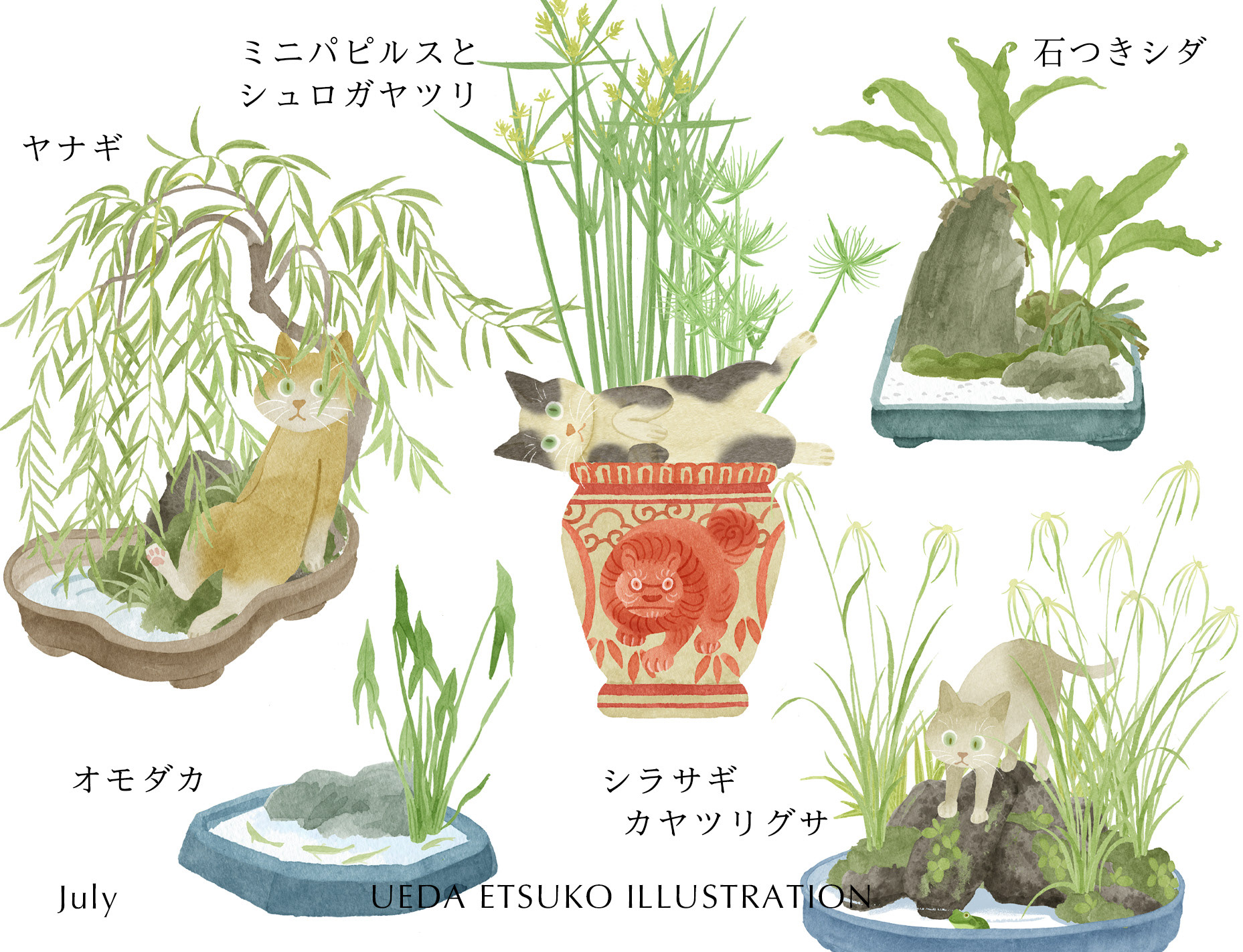 いち早くやってきた夏の暑さをしのぐべく、7月の盆栽のテーマは見立てと水辺。
